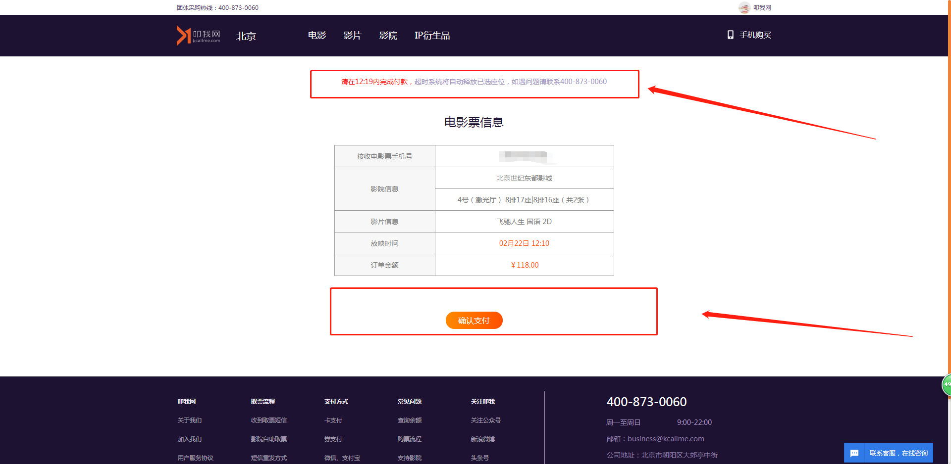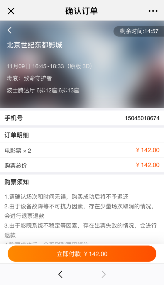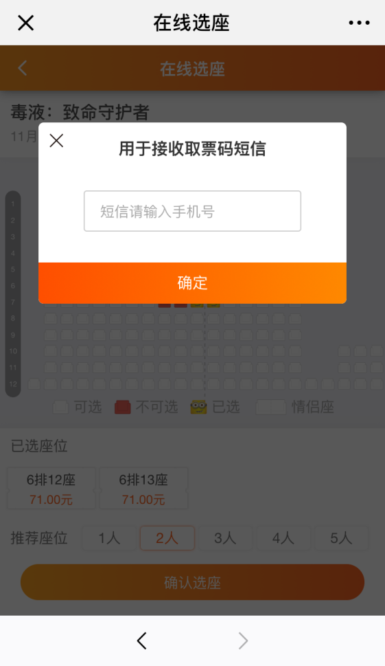 2、填写取票手机号码,锁定座位,并确认场次信息(15分钟内未完成支付则自动释放座位)