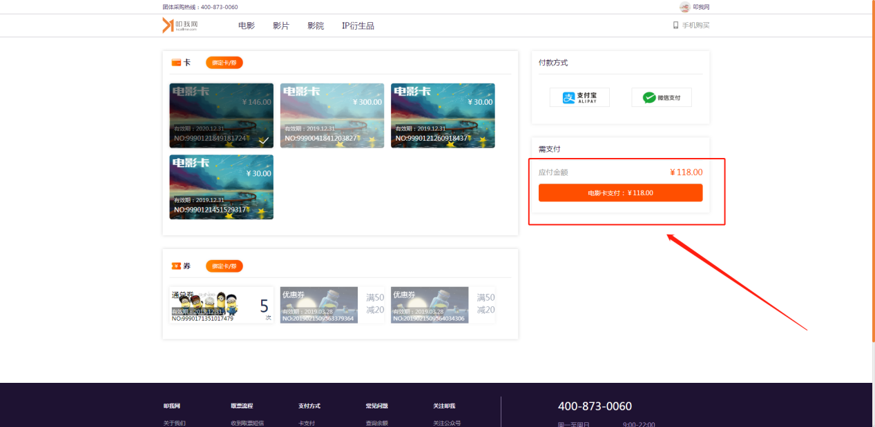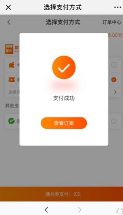 第四步:进入支付页面,勾选支付卡券,点击支付框进行支付