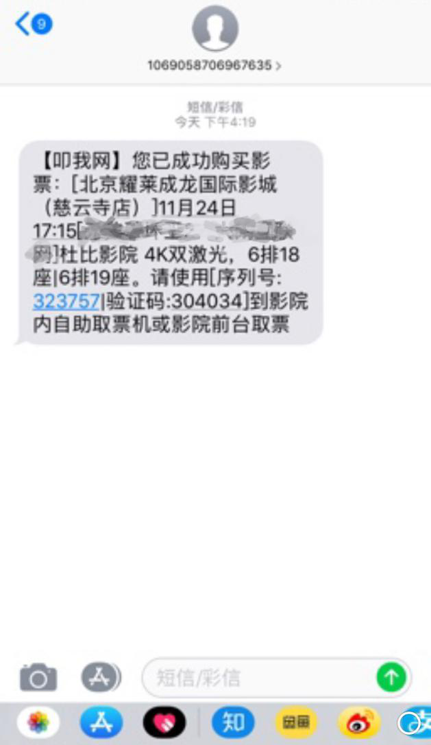 第五步:支付成功后,叩我网系统会给填写的接收手机号中发送取票兑换码,请各位网友以短信中提示的取票方式到影院取票观影,或使用订单中二维码和取票号进行取票。