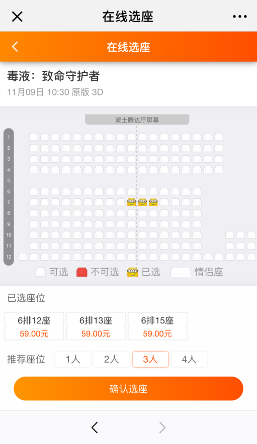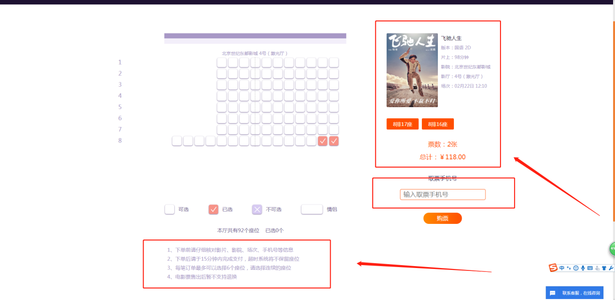 第二步:选择座位、输入取票手机号码、核对场次信息